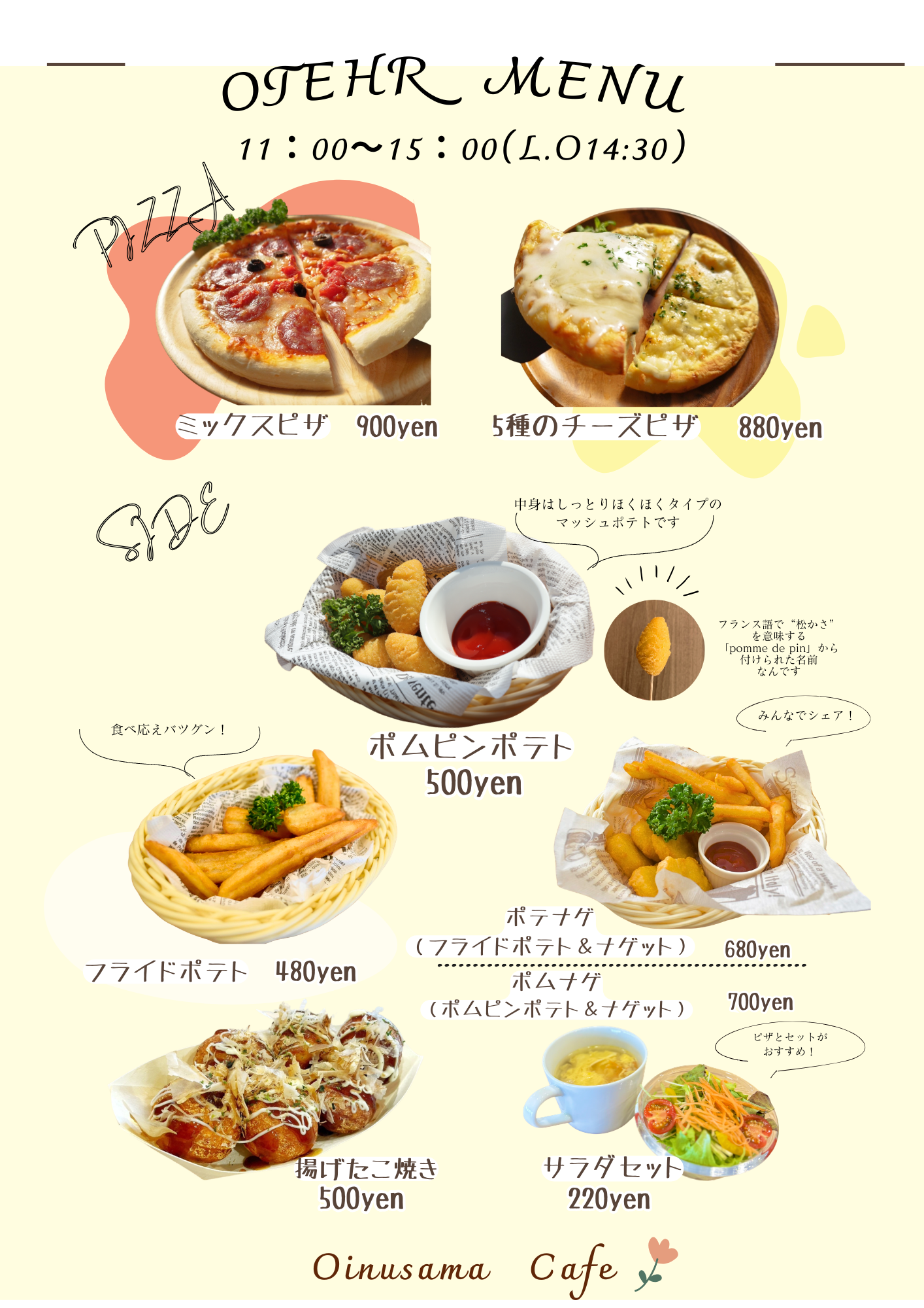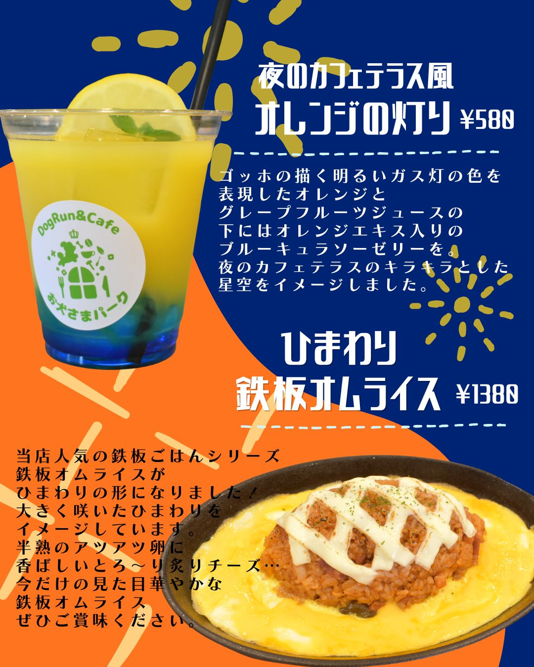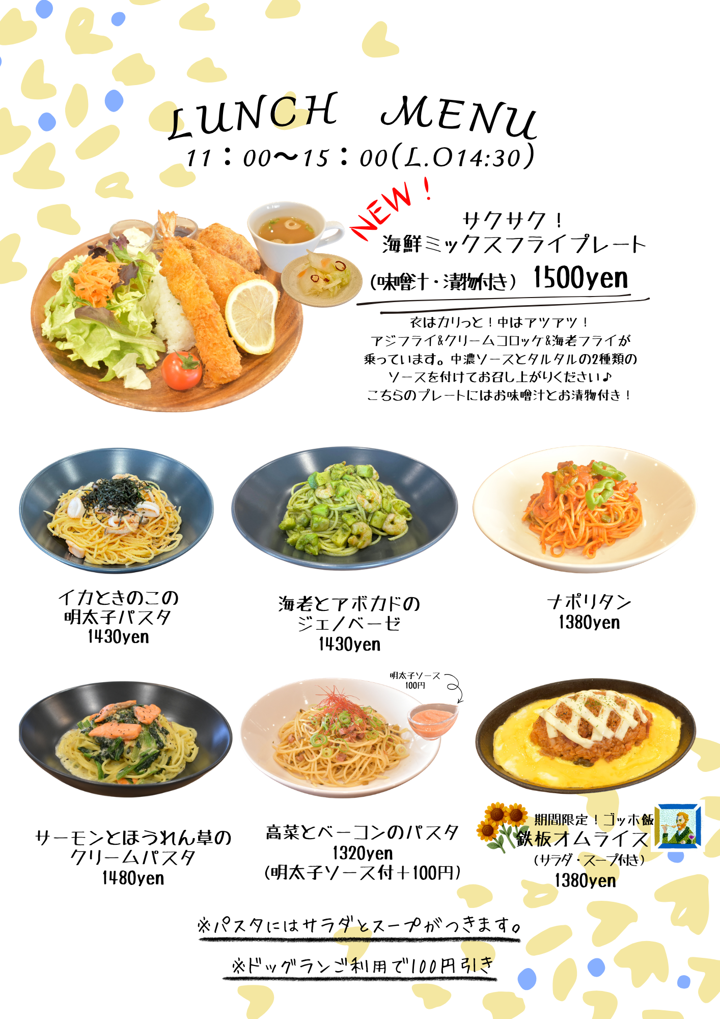 | 特典 | 特典1 ドリンク→¥100OFF 特典2 物販→10%OFF 特典3 10回ドッグラン利用毎にフード1品とドリンク一杯無料! |