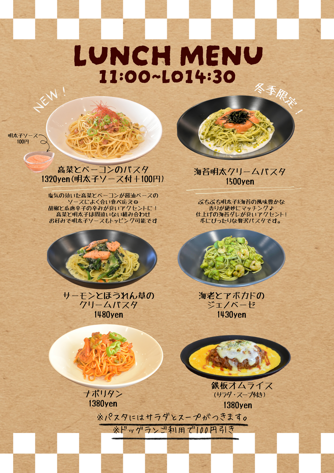 | 特典 | 特典1 ドリンク→¥100OFF 特典2 物販→10%OFF 特典3 10回ドッグラン利用毎にフード1品とドリンク一杯無料! |
